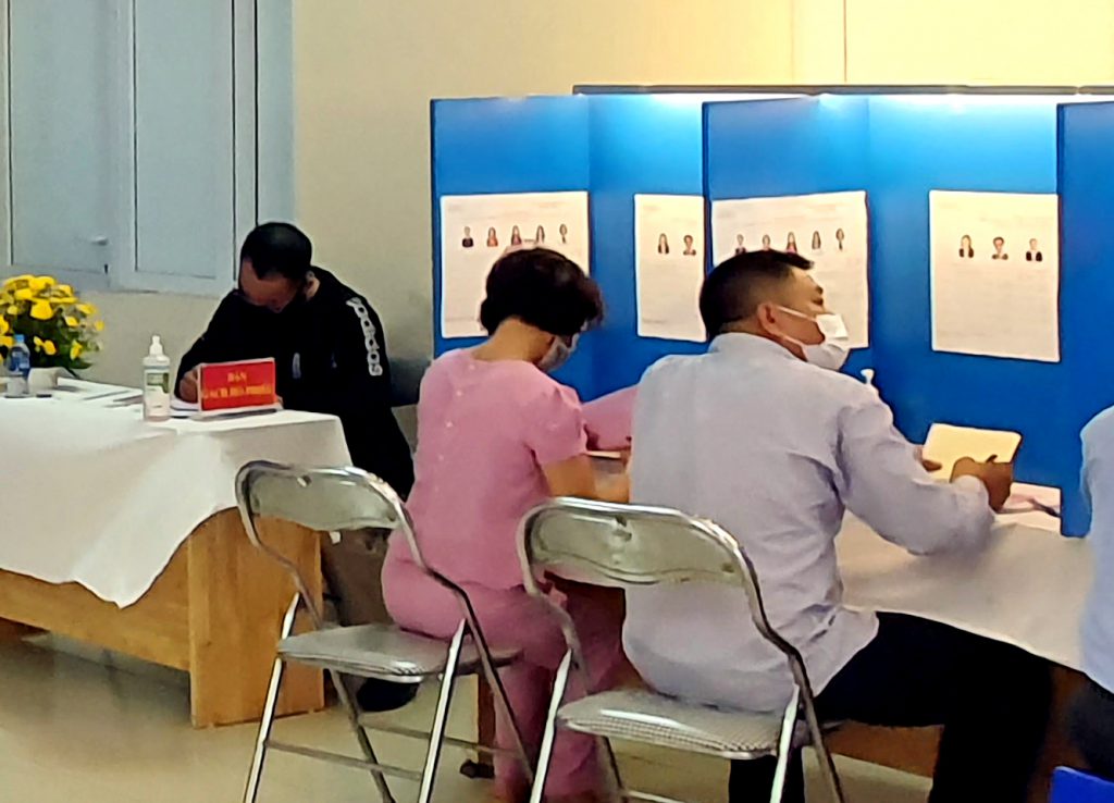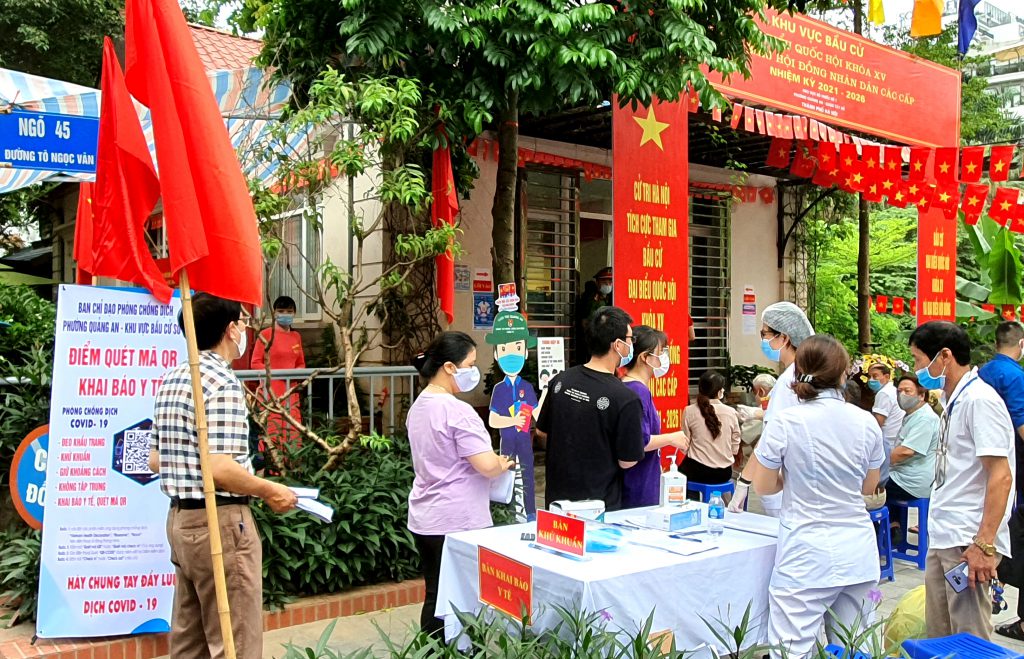 Tại khu vực bỏ phiếu số 7, phường Quảng An, quận Tây Hồ, Hà Nội công tác đảm bảo phòng chống dịch COVID -19 được thực hiện đúng quy định 5K