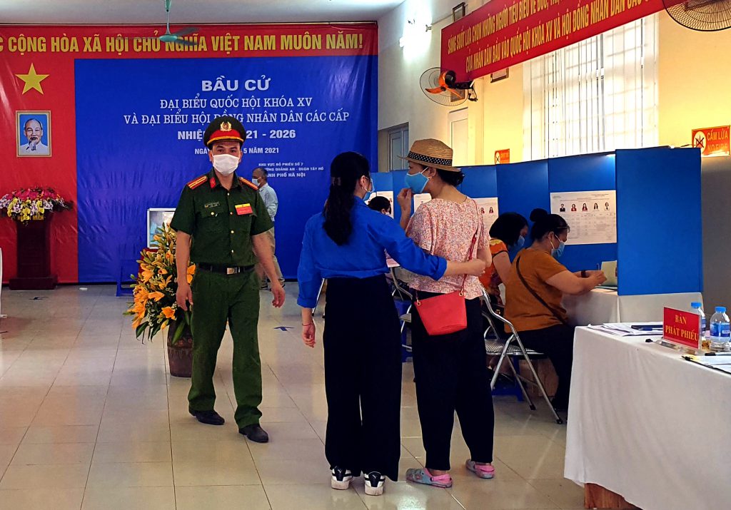 Các chiến sỹ công an và lực lượng thanh niên tình nguyện đón tiếp, hướng dẫn cử tri đi bỏ phiếu