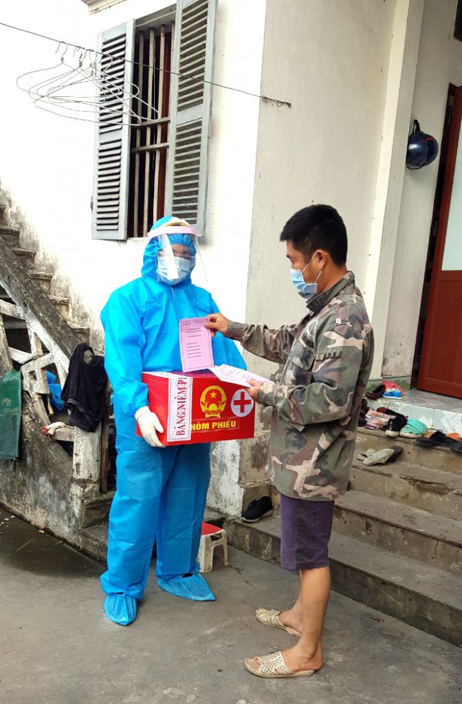 Anh Ngô Văn Trạng – Bí thư Chi Đoàn thuộc tổ bầu cử thôn Lê Dương, xã Tam Hưng, huyện Thanh Oai mang hòm phiếu tới tận nhà người dân đang thực hiện cách ly y tế để công dân thực hiện quyền bỏ phiếu