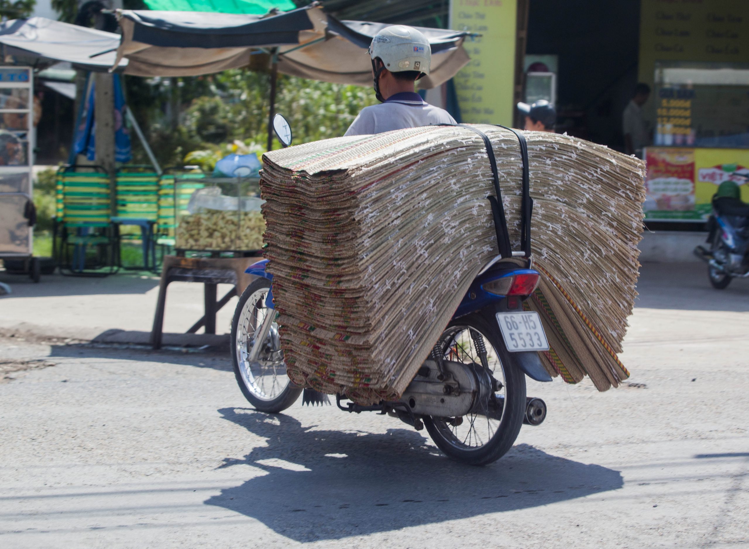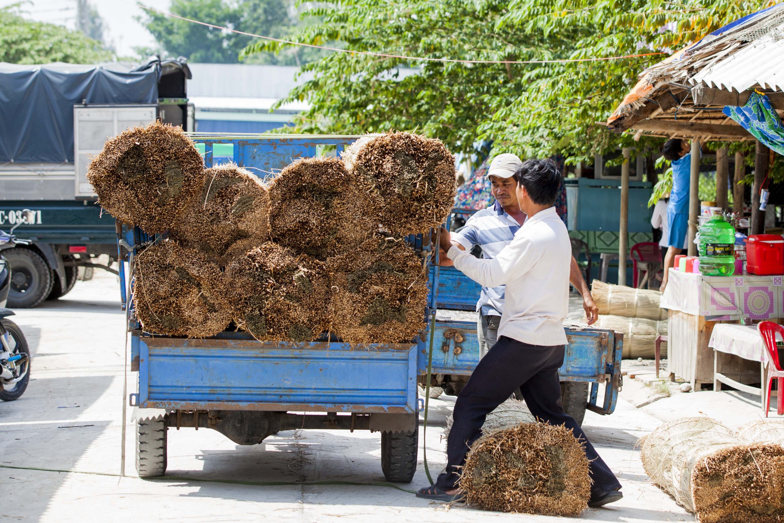 Các bó cói được đưa lên bờ, sau đó chuyển lên các phương tiện giao thông như xe ba gác, xe tải nhẹ để về nơi sản xuất