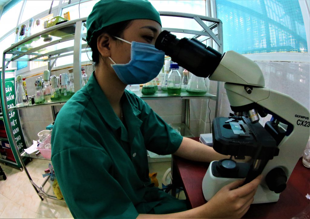 Kỹ thuật viên kiểm tra mẫu giống tảo Spirulina