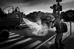 Ảnh treo Cuộc thi và triển lãm ảnh báo chí “Cuộc sống thường ngày” năm 2021. Tác phẩm NSNA Đức Nghĩa Chủ Nhiệm CLB ABC CN7 Nhà Văn Hóa HNBVN đang tác nghiệp các chiến sỹ Bộ Đội Quân Khu 3 phun thuốc khử trùng phòng chống COVID. Tác giả Vũ Dũng